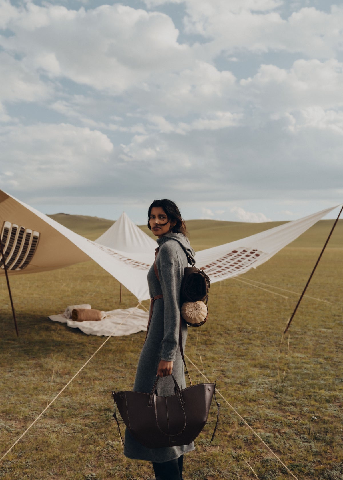 This sculptured tote bag featuring waves, folds, and curves can be used in two ways. The first is a basket, its sides open, its straps on the outside. The second is a floral, closed bag, its sides tucked in, its straps crossing on the inside. Its name was inspired by the French word “cime”, meaning a peak or mountain crest, in reference to the ridge running along it.