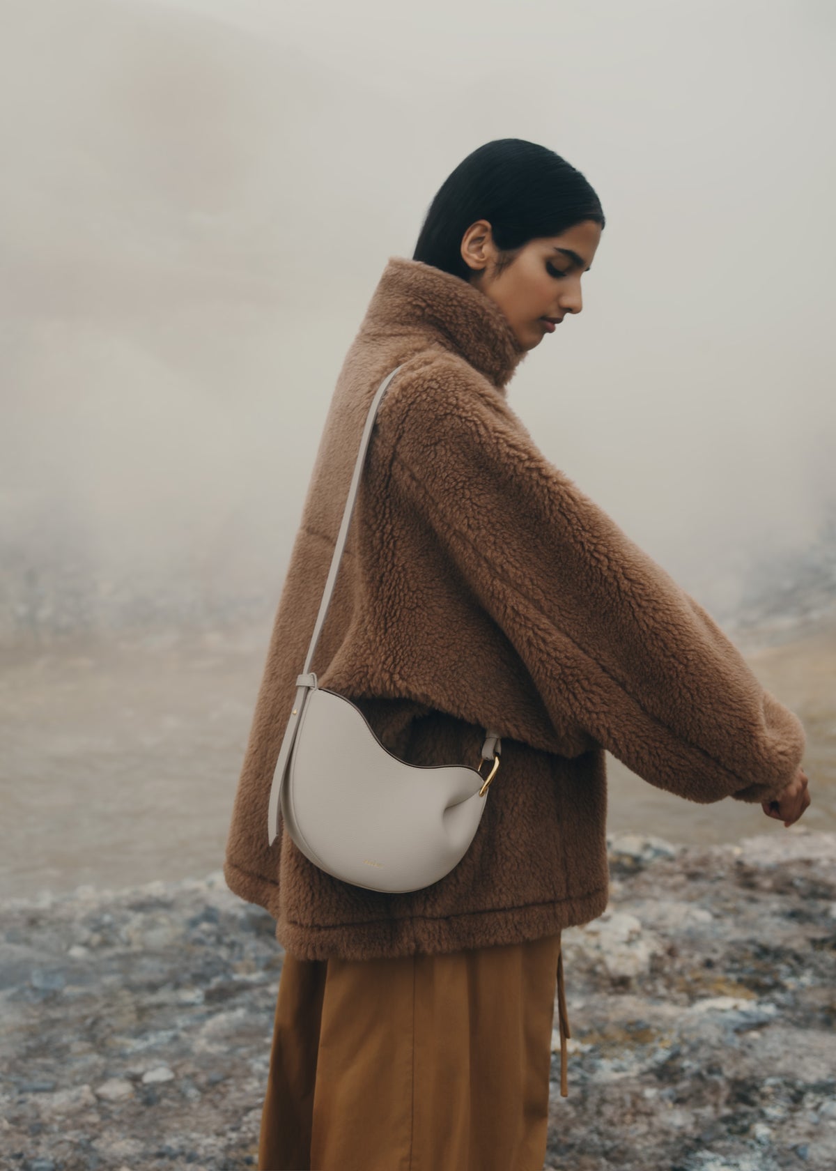 Achieved by shaping the leather around a wooden mold, the “Tonca” bag’s roundness is rooted in its folds that blend into a twisted metal buckle. The bag’s contrasting body and shoulder strap feature smooth and textured leather. Its name was inspired by the tonka bean, in honor of its molded shape.