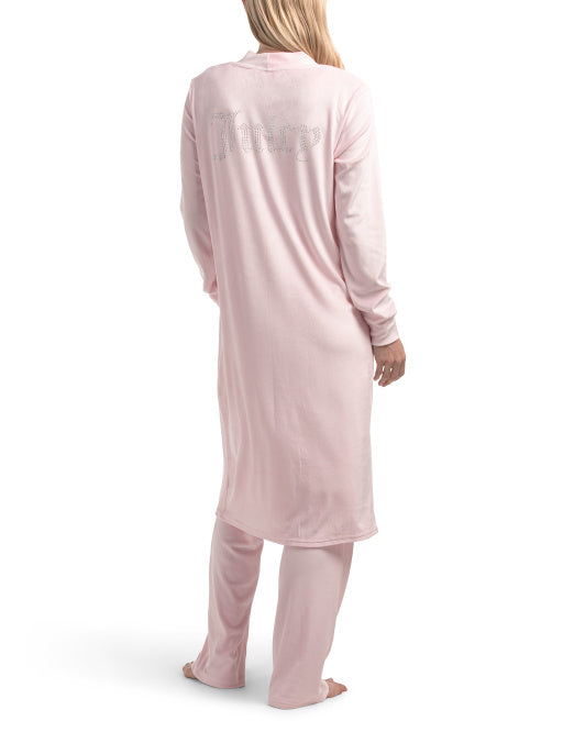 - 3 piece set includes tank top, long sleeve duster and matching pants, velvet fleece finish, fabric provides stretch